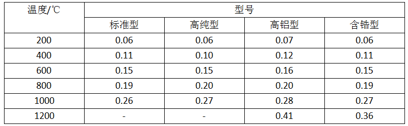 根據(jù)其工藝的不同,陶瓷纖維毯可分為甩絲毯和噴吹毯兩大類(lèi),兩種類(lèi)型的陶瓷纖維毯性能見(jiàn)表1。不同溫度下陶瓷纖維毯的導(dǎo)熱系數(shù)見(jiàn)表2。