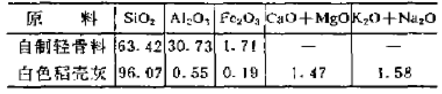 主要原料為自制輕骨料和白色稻殼灰;瘜W(xué)成分見表2,輕骨料的容量為1.61g/cm3、顯氣孔率為42%,耐壓強度27MPa。