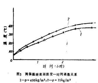 從圖2可以看出,密度大保溫磚比密度小的保溫磚早約7~8分鐘升到900℃,停電后降溫也慢。反復(fù)實驗結(jié)果相同,另一方面,從圖2可以看出珍珠巖保溫磚表面溫度也反映出密度大的平衡溫度低,保溫效果好。