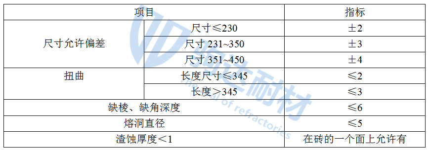 表2 熱風(fēng)爐用黏土磚的尺寸允許偏差及外觀