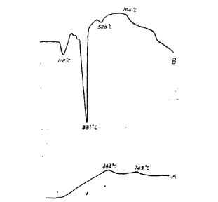 由上述數(shù)據(jù)中冷態(tài)強(qiáng)度的突變可以認(rèn)為:莫來石約在1000℃時(shí)形成,這也可以用熱力學(xué)計(jì)算加以證明,例如γ-Al2O3與無定形SiO2之間形成莫來石的△G900k已為-38.2千焦。而α-Al2O3與無定形SiO2之間形成莫來石的△G1100k則為-0.26千焦。也就是說,α和γ-Al2O3只要充分活化后滿足動力學(xué)條件,則分別可以在827℃和327℃就能形成莫來石了。但是由圖2的1000℃×3h燒后的試樣中并不能觀察到晶態(tài)莫來石的存在,對此,我們認(rèn)為:在如此低的溫度下,雖然莫來石可以形成,但由于擴(kuò)散量很小,所以形成的初生態(tài)或非化學(xué)計(jì)算莫來石并不能長大成為足以觀察到的莫來石晶體,但卻已發(fā)揮了其較大的結(jié)合強(qiáng)度,為了進(jìn)一步證實(shí)我們這一推測,我們對A、B兩種復(fù)合膠結(jié)劑分別作了差熱分析、其差熱曲線如圖3所示;