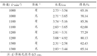 首先采用實(shí)驗(yàn)室自行改裝的粉碎機(jī)對硅酸鋁纖維進(jìn)行切斷。打漿條件及打漿后纖維長度和得率見表2。
