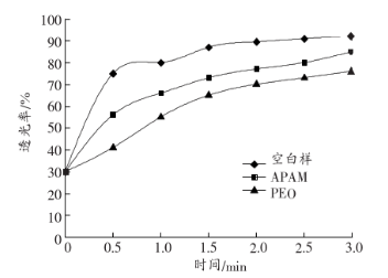 PEO和APAM是造紙中常用的分散劑。實(shí)驗(yàn)選用經(jīng)過打漿處理的硅酸鋁纖維漿料作為實(shí)驗(yàn)漿料,在漿料中加入分散劑的質(zhì)量分?jǐn)?shù)分別為0、0.5、1.0、1.5、2.0和2.5%(相對于硅酸鋁纖維用量)。通過實(shí)驗(yàn)表征硅酸鋁纖維的分散性能及透光率。結(jié)果分別見圖4和圖5。