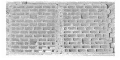 抗壓強(qiáng)度為4. 4N/mm2。該多孔磚的缺點(diǎn)是;其在工業(yè)化的生產(chǎn)中不可避免地會出現(xiàn)扭曲變形,因此,擠出型的微孔多孔磚必須具有足夠厚度的外壁和齒狀的凸起,便于磚相互間組裝拼接(見圖6),從而消除砂漿連接引起的熱力學(xué)問題。在隨后的試驗(yàn)中還擠出成型了19排孔和13排孔的10DF微孔多孔磚見圖6圖7 ,這些磚外壁還有齒狀的凸起。